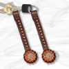 Copper Sunrise Key Fob, this is not your normal key fob. This versatile fob can be used for Keys, Hoof Pick, Bag Zipper-Pull, Gate openers, and many other small items that are always being lost or misplaced. Made from the same Premium Chocolate Brown leather as our belts, this Fob has an Antiqued copper flower, copper spots and includes a 1″ key ring.