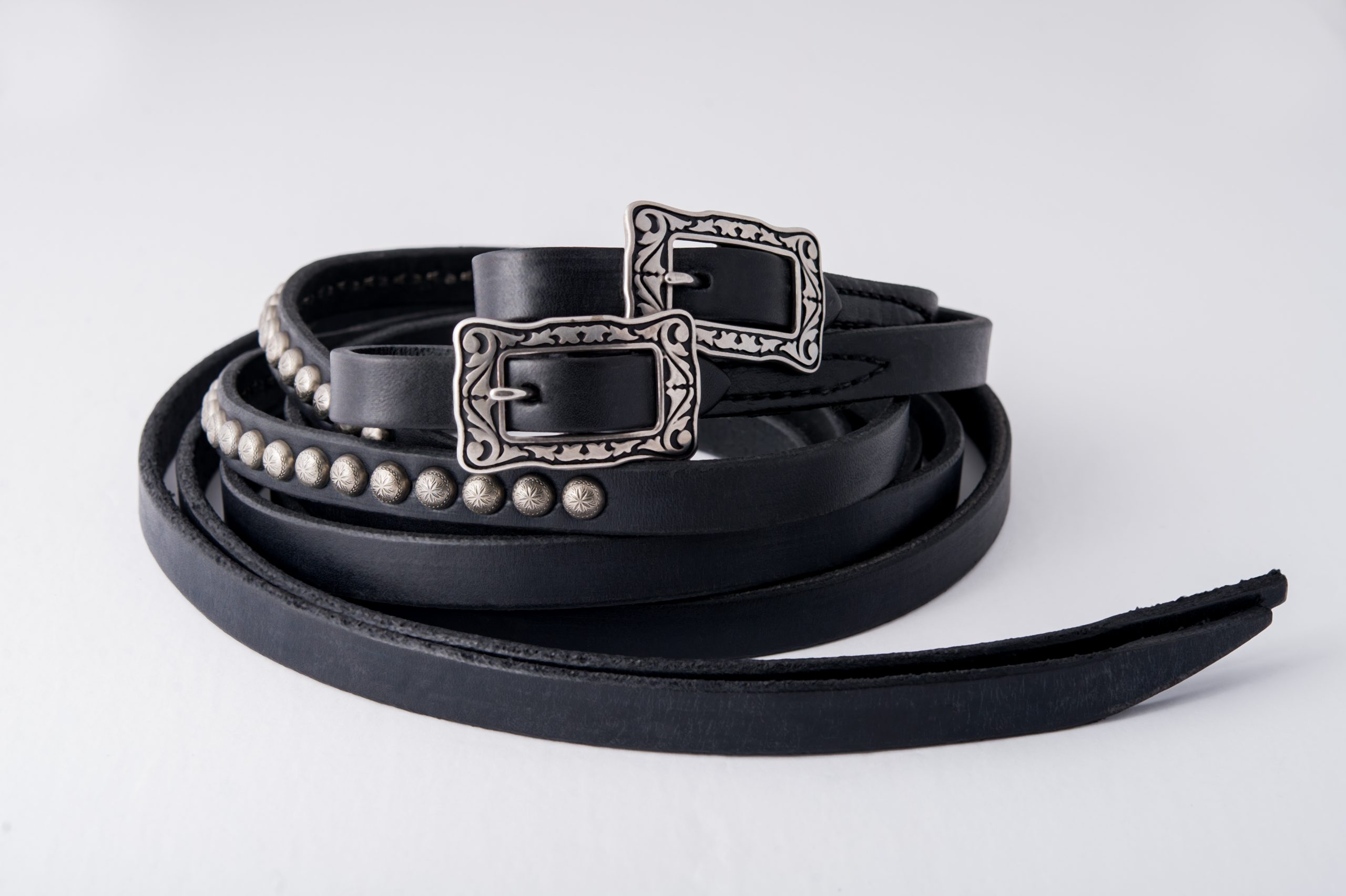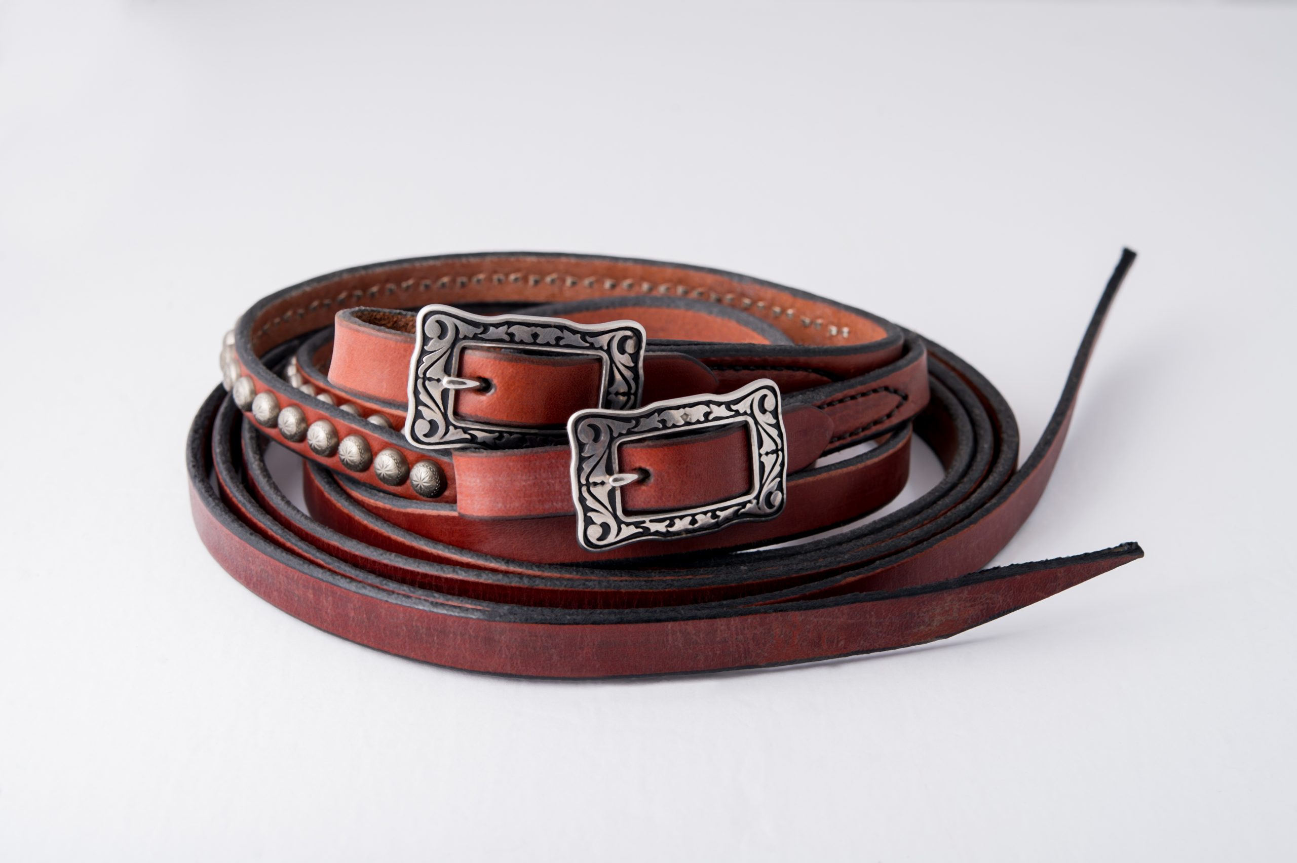 This is the same rein as our Deluxe Western reins (see for complete description), but they are enhanced with a 12” section of etched sunburst pattern antiqued silver spots several inches up from the buckle end. This makes for a very flashy yet tasteful look.