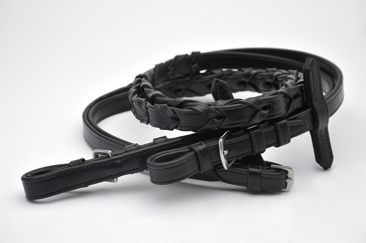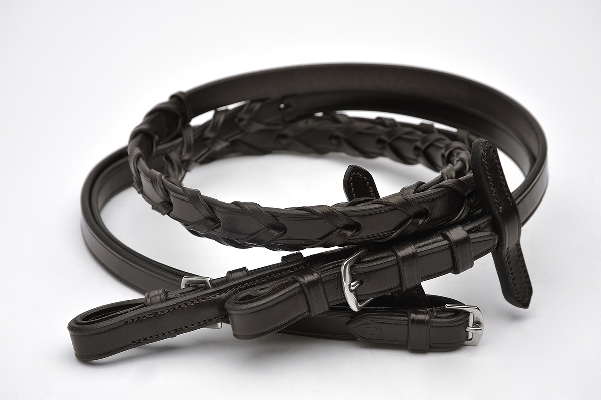 Laced English Leather Reins are made 5/8” wide 54′ long, out of genuine Sedgwicks of England English Bridle leather to match all our English Bridles. Available in Havana Brown, Black, or English Tan.