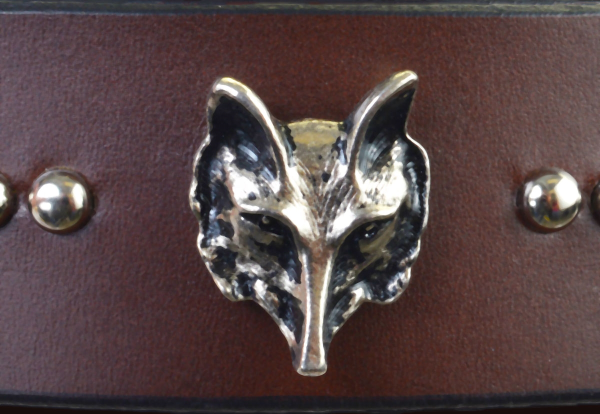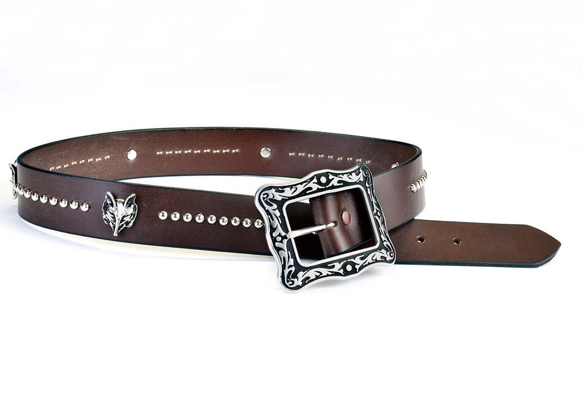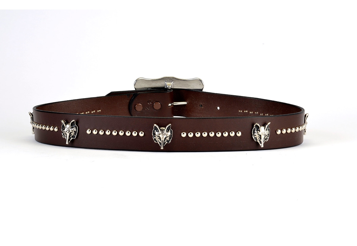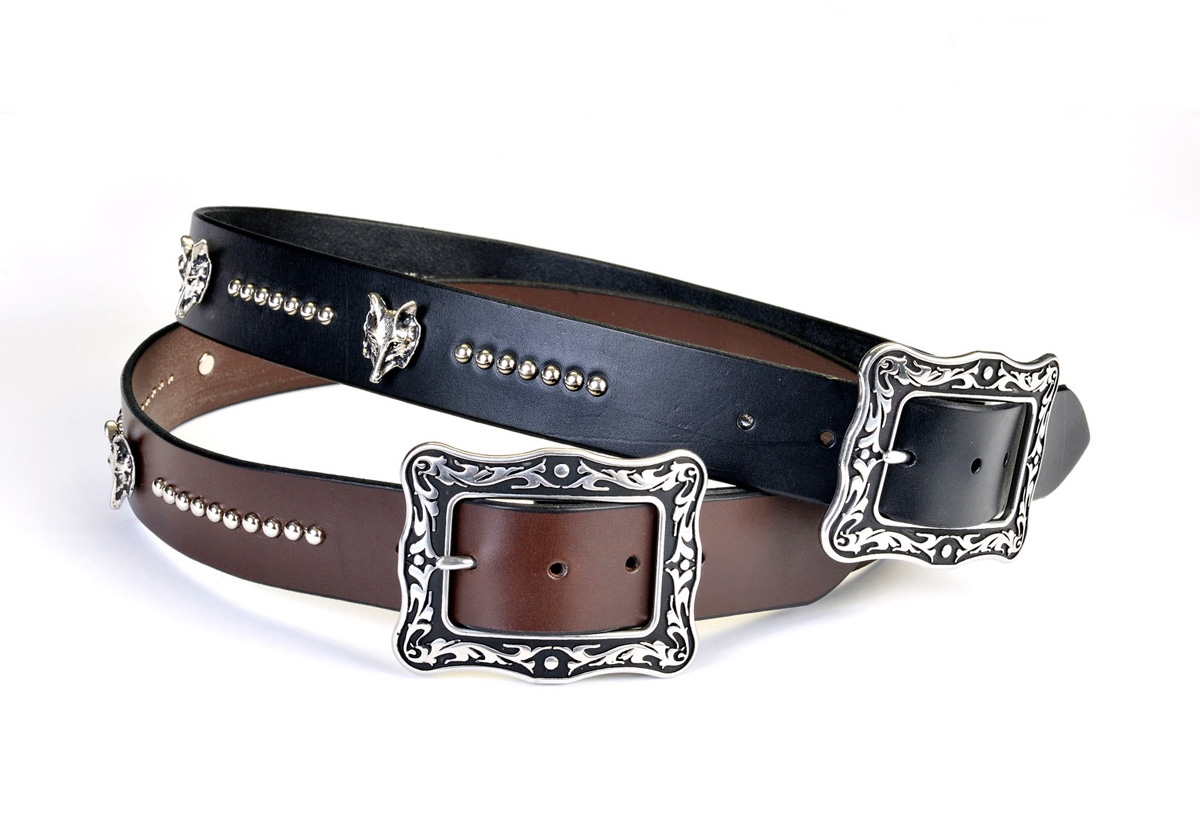 Hunt Club Ladies Fox Head Belt, put this belt on and be taken over by the feel of an English Country Fox Hunt. Made of 1 1/2″ wide Black or rich Chocolate Brown 8-10oz premium American leather here in our workroom . Hand rubbed finish for a luxurious feel. Silver tone with black accents, raised 3 dimensional realistically sculpted Fox Heads and silver tone spots. Comes with a silver tone and black accent engraved scalloped buckle.Complete your look with the matching double-wrap fox -head bracelet. Sure to make a statement with your breeches or your favorite pair of jeans.