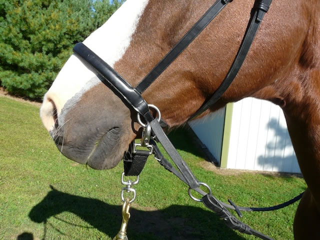 Our Lunge Strap is made in the USA out of quality double sewn nylon with large easy to use snaps. This makes it easy to lunge or lead your horse with the Dr. Cook Bitless Bridle. To convert the Dr. Cook Bitless Bridle into a halter, remove the reins. Gather the O ring on the end of the crossunder strap that is hanging on the opposite side. Bring it under the chin and include this ring when clipping the lunge strap onto noseband O ring. You will have both O rings contained in the clip. Do this for each side, Hook your lead under the chin. For Lungeing with reins removed. Follow the instructions to convert the Dr. Cook Bitless Bridle into a halter and clip your lunge line under the chin. This will be the most useful accessory for your Dr. Cook Bridle.