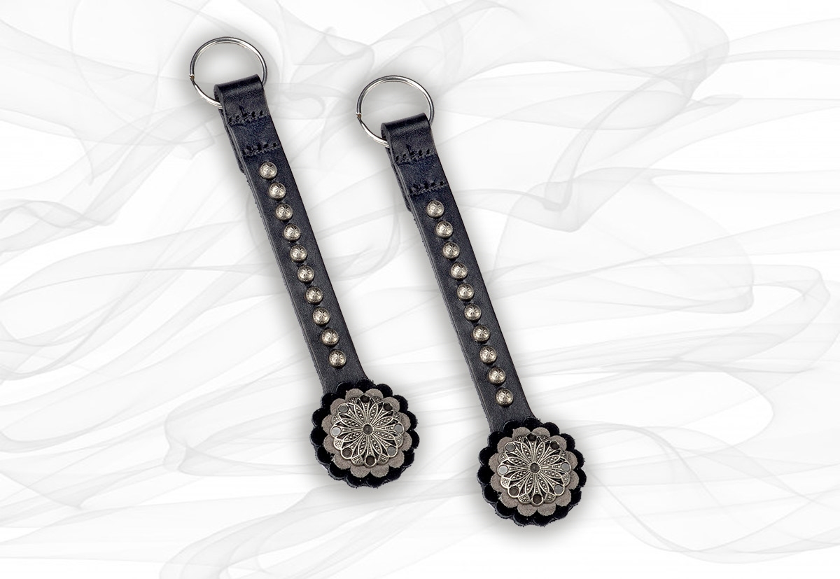 Park Avenue Key Fob, this is not your normal key fob. This versatile fob can be used for Keys,Hoof Picks, Bag Zipper Pulls,Gate openers, and many other small items that are always being lost or misplaced. Made of our Premium Black leather with antiqued silver tome flower and sunburst spots. Accented with Gray and Black suede under flower concho.