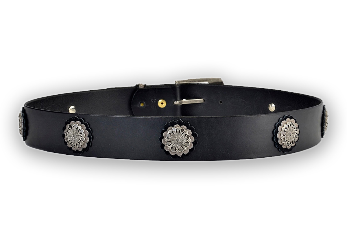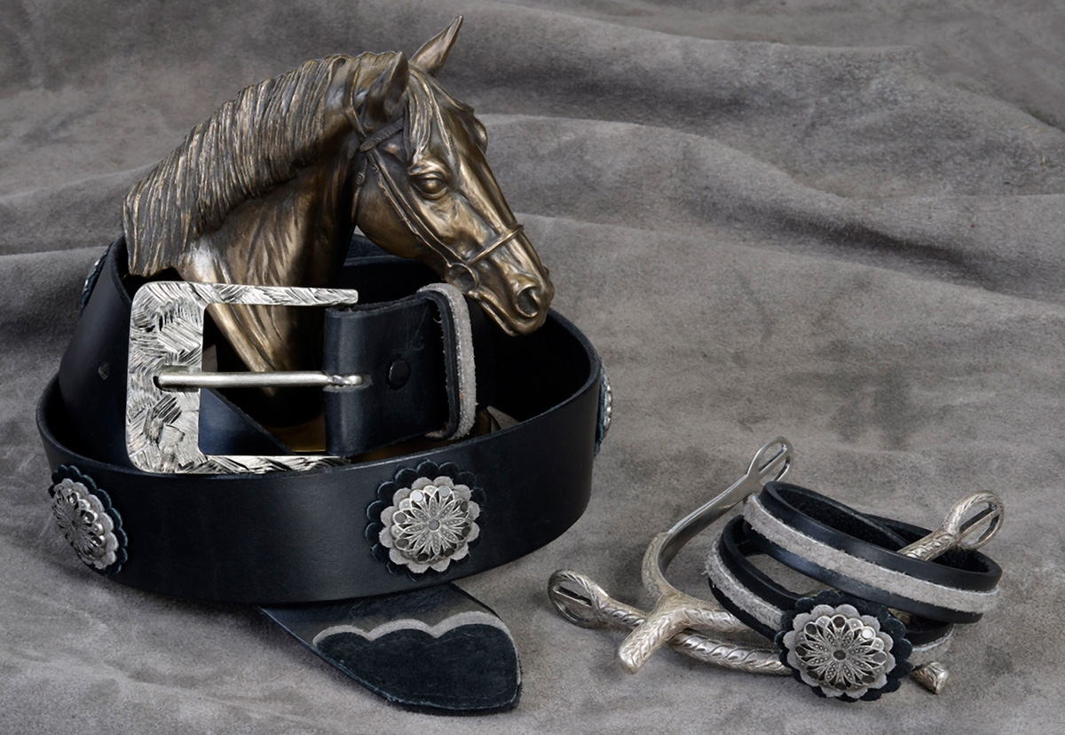 Park Avenue Ladies belt, Designed with antiqued sliver tone flower conchos , richly accented with gray and black suede backing. Matching 2-tone suede tip and loop. Complete with engraved antiqued silver tone buckle. Made out of 1 3/4″ wide premium 8-10 oz American leather. This belt really sparkles in the sun light. Looks great with white breeches,will complement any western show outfit or to add some extra sparkel to your favorite pair of jeans. Your friends will think you paid designer price for this belt.
